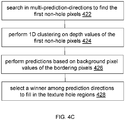 - the pixel value of a texture hole pixel as described herein can be filled with that of a specific bordering or nearest background pixel (e.g., available along a filling order, available with a prediction direction, etc.).