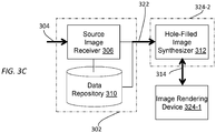 - synthesized texture data 114 As a result of the DIBR operations (104), synthesized texture data 114, associated depth data 116 (which indicates depth information for pixels represented in the texture data (114)) and a texture hole mask 118 (which indicates where holes are in the texture data (114)) are generated for the synthesized view (120).