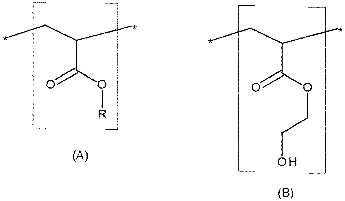 - composition in accordance with the invention comprises at least one lipophilic polymer comprising monomeric units of formulae (A) and (B): in which: