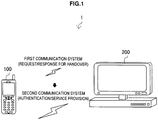 - a computer program product having instructions that when read by a CPU cause an information processing apparatus, which controls a communication apparatus including a first communication unit having a first communication range, a second communication unit having a second communication range wider than the first communication range, and a notification unit which carries out a notification for a user, to perform a function as a control unit which transmits a response signal in response to the request signal from the first communication unit to the another communication apparatus after the first communication unit receives a request signal for starting communication via the second communication unit from the another communication apparatus, transmits a result of authentication based on the authentication information from the second communication unit to the another communication apparatus after the second communication unit receives authentication information from the another communication apparatus, and causes the notification unit to carry out a notification for the user to after performing the authentication based on the authentication information; and an authentication unit which authenticates the communication with the another communication apparatus via the second communication unit based on the authentication information and outputs the result of the authentication.