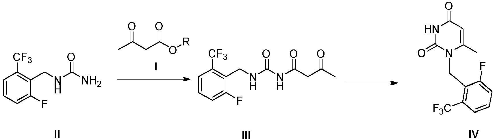 - the present invention is accomplished, in order to overcome the defects of using toxic reagents, low yield, troublesome post-treatment and the like during the process for preparing the compound of Formula IV of the intermediate of elagolix in the prior art.