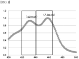 - the azomethine metal complex pigment (A) has a maximum absorbance (A1 max ) and a maximum absorbance (A2 max ) in a wavelength range of not less than 440 nm and less than 465 nm and in a wavelength range of not less than 420 nm and less than 440 nm, respectively.