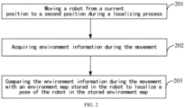 - the robot may move from the current position to a new position during the localizing process, more environment information may be acquired during the movement, and then the acquired environment information is compared with the environment map stored in the robot, which facilitates successfully localizing the pose of the robot in the stored environment map.