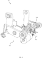 - the securing assembly comprises a securing member that pivots about a first axis between a free position and a securing position when the securing assembly moves between the free position and the securing position, wherein the securing member comprises a restraint that, when the securing assembly is in the securing position, engages the retaining arm to secure the retaining arm in a secured retaining position.
