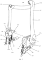 - the restraint includes a latch that pivots about a second axis between a free and a securing position, the latch, when in the securing position, engages a slot in the retaining arm to secure the retaining arm in the secured retaining position.