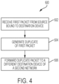- WO 2016/097459 A1 discloses a network tap apparatus comprising a plurality of network interfaces, at least one processor to receive, via a network interface, a packet from a source device, the packet being bound for a destination device, the source device and the destination device being nodes of a first network, the source device and the destination device each being associated with a respective internet protocol, IP, address, generate a duplicate packet that is a copy of the packet, and forward, using another network interface, the duplicate packet to another destination device in a second network, the other destination device in the second network having an IP address that is identical to that of the destination device in the first network.