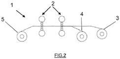 - In operation, a coil is inserted into the POR, the head end is threaded into the DTR and put under tension, and specified reduction force is applied to the cylinders of the mill. Thereafter rolling of the first pass is carried out. The tension becomes lost when the coil tail is taken out of the POR, defining off-gauge length of strip. The latter can be reduced or minimized for example by continuing to apply tension thanks to a friction force using a strip press. The second pass (reversed) can then be started, the tail end of the strip being threaded into the ETR and the process continues as in the first pass. Rolling is repeated a number of times until the final thickness gauge of the product is attained. The number of rolling passes can be even (2, 4, 6, etc.) or odd (1, 3, 5, etc.).