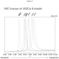 - a different hydrophobic interaction column and/or method can be calibrated using conjugates from Tables 2 as references to determine reference conjugate mobilities (elution times) on the selected column and/or method.