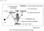 - Fig. 20 when negative ions directly collide with the scintillator, there is a high possibility that the negative ions will pass through a conductive layer on a surface of a scintillator 81 and reach a light-emitting layer (light guide) 82 made of GaN or the like. In that case, a phenomenon occurs in which a crystal arrangement of the light-emitting layer 82 is damaged to allow the crystal to collapse, or negative ion elements as impurities are injected into the crystal to change a band structure, and thus, an original light-emitting mechanism is hindered, which may cause a decrease in light emission intensity or degradation of the scintillator.
