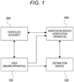 - a user 100 for example, a user 100, a certificate authority 200, a distribution service 300, and a verification service 400 appear.