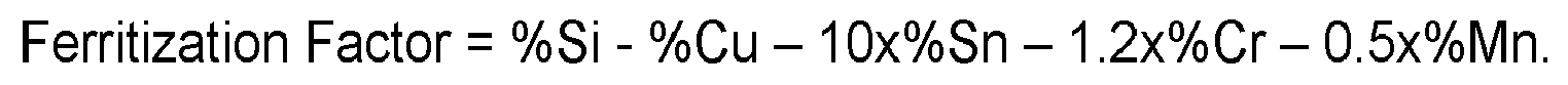 - Ferritization Factor % Si ⁇ % Cu ⁇ 10 ⁇ % Sn ⁇ 1.2 ⁇ % Cr ⁇ 0.5 ⁇ % Mn .