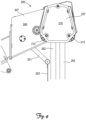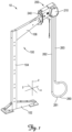 - the upright frame 100 includes a longitudinally x and laterally y extending base 102 in contact with ground, a transversely z / vertically extending stanchion 104, and preferably a longitudinally x / horizontally extending boom 106.
