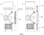 - the shelf located in the foreground 7A with respect to track 4 is divided into two elements 7A1 and 7A2. These two elements are mounted on a rolling rail 70 placed on the ground and are guided by a guide rail in their upper part (not shown).