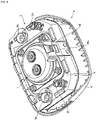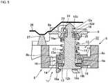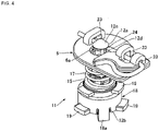- the damper 11 is made up of a straight shaft-shaped pin 12 that has a connecting tip end part 12a and a base plate part 12b on both ends, a circular insulator 13 encircling the pin 12 and superimposed on the base plate part 12b, a circular rubber 14 encircling the pin 12 and superimposed on the circular insulator 13, a cylindrical insulator 15 with a first spring seat 15a that is superimposed on the rubber 14, provided encircling the pin 12, a collar 16 with a second spring seat 16a, formed in a circular shape encircling the pin 12, provided freely slidable in the axial direction of the pin 12 on the connecting tip end part 12a side and abuts the back side of the module housing 6, a coil-shaped horn spring 17 provided encircling the pin 12 between the first spring seat 15a and second spring seat 16a elastically supporting the module housing 6 via the collar 16,