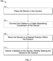 - a method of installing a device for separating cables and sealing a conduit comprises placing the device in the conduit; connecting the cables to a cable-separating component of the device; moving the device to a desired position within the conduit; and delivering a sealant to the device, thereby sealing the device to the conduit.