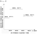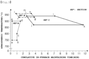 - Heating in section B satisfies conditions specified by a figure ⁇ fghi' having cumulative in-furnace maintaining times and atmospheric temperature coordinates of approximately f 1.3 + t ⁇ 1.2 0.6 ⁇ 0.5 min , 930 ° C , g 3.8 + t ⁇ 1.2 0.6 ⁇ 0.5 min , 930 ° C , h 3.3 + t ⁇ 1.2 0.6 ⁇ 0.5 min , 960 ° C , and i 0.8 + t ⁇ 1.2 0.6 ⁇ 0.5 min , 960 ° C .