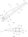 - the airfoil region 34 has an airfoil profile with a chord extending between the leading edge 18 and the trailing edge 20 of the blade 10. The width of the chord decreases with increasing distance r from the hub.