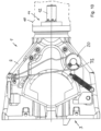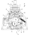 - the angular gear is connected to the frog via an articulated lever, which is at least two-part, comprising a first lever part that is articulated to the frog, and a second lever part that is articulated to the first lever part and articulated to an angular gear output, wherein the axes of rotation of said articulated connections are parallel to the main axis.
