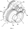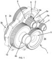 - the just cited central plane (2a) can just be ideally defined as a (geometric and non-material) separation surface/entity between the half-spaces (2b) and (2c), or it can be physically embodied by a material element, such as a plate-like element or body essentially resting in the middle of the frame (2) supporting the remaining elements of the gearbox (1) according to the present invention.