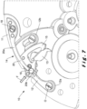 - the present invention also relates to a watch mechanism comprising a functional member arranged to be movable in rotation of center O around an axis of rotation Z in a plane XY perpendicular to the axis Z between a minimum angular position in which the functional member is inactive and a maximum angular position taken by said functional member during the performance of a function with which said functional member is associated, said functional member carrying a support element of circular section extending parallel to the Z axis and subjected to the action of a spring as defined above, said spring comprising a heel secured to a frame and an elastic blade extending longitudinally in the plane XY in the direction of the functional member and comprising a first end secured to the heel and a second end arranged to cooperate with the support element, the second end of the blade being pivotally mounted on said support element, and the blade being arranged to be in compression between the heel and the support element during the movement of the support element at least between two angular positions included between the two minimum and maximum angular positions of the functional member.