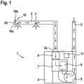 pressure sensor arrangement 10 to themonitoring unit 11 in a data-transmitting manner (illustrated by circle segments). The data communication device can comprise radio or cable transmission techniques. The data communication device can comprise e.g. a Wi-Fi, near field communication (NFC), Bluetooth, Zigbee, Zwave device etc. The data communication device can be comprised in the housing of the ASD 1 and/or in themonitoring unit 11. The data communication device can also be a separate device that is connected to themonitoring unit 11. - The ASD can comprise a single pipe configuration with one pipe connected to the detector and extending through the entire covered space, as shown in