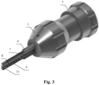 - the longitudinal channel 25 Two technological grooves, the longitudinal channel 25, and another end technological groove are arranged subsequently longitudinally on one wide side of the flat part of the carrier 4, the longitudinal channel 25 also extends into the cylindrical part of the carrier 4 and communicates with the through holes 18, 19, 20, and optionally the hole 21, of the cylindrical part.