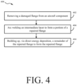 - A method of repairing a flange of an aircraft component, the method comprising:removing a damaged flange from the aircraft component, the aircraft component including a metal alloy, the aircraft component originally formed by casting;arc welding an intermediate layer of a first material to a base surface formed from the removing, the intermediate layer forming a portion of a repaired flange; andbuilding up, via direct energy deposition, a remainder of the repaired flange with a second material to form a remaining portion of the repaired flange.