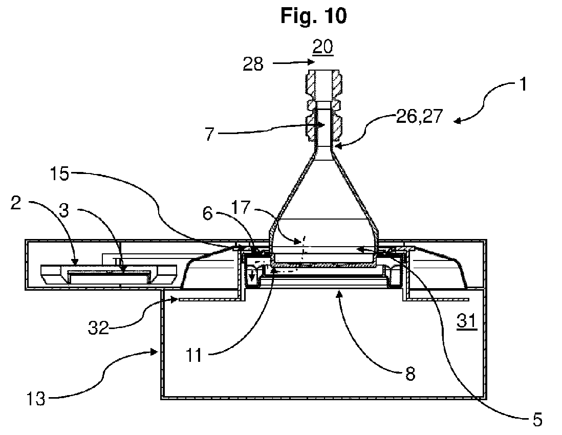 Erfindungsgemäß wird somit zur Überwachung mikrobiellen Wachstums vorgeschlagen, dass ein Fluidstrom über eine Fluidleitung aus einem Reinraum in eine kontrollierte Umgebung abgeführt wird, wobei in der kontrollierten Umgebung ein Nährmedium präsentiert und mit dem der Fluidstrom kontaktiert wird und anschließend so aus der kontrollierten Umgebung entnommen wird, dass ein Reinraumprozess nicht unterbrochen werden muss (Vgl. Fig. 10). According to the invention, it is therefore proposed to monitor microbial growth by discharging a fluid stream from a clean room into a controlled environment via a fluid line, wherein a nutrient medium is presented in the controlled environment and contacted with the fluid stream and is then removed from the controlled environment in such a way that a clean room process does not have to be interrupted (see Fig. 10).