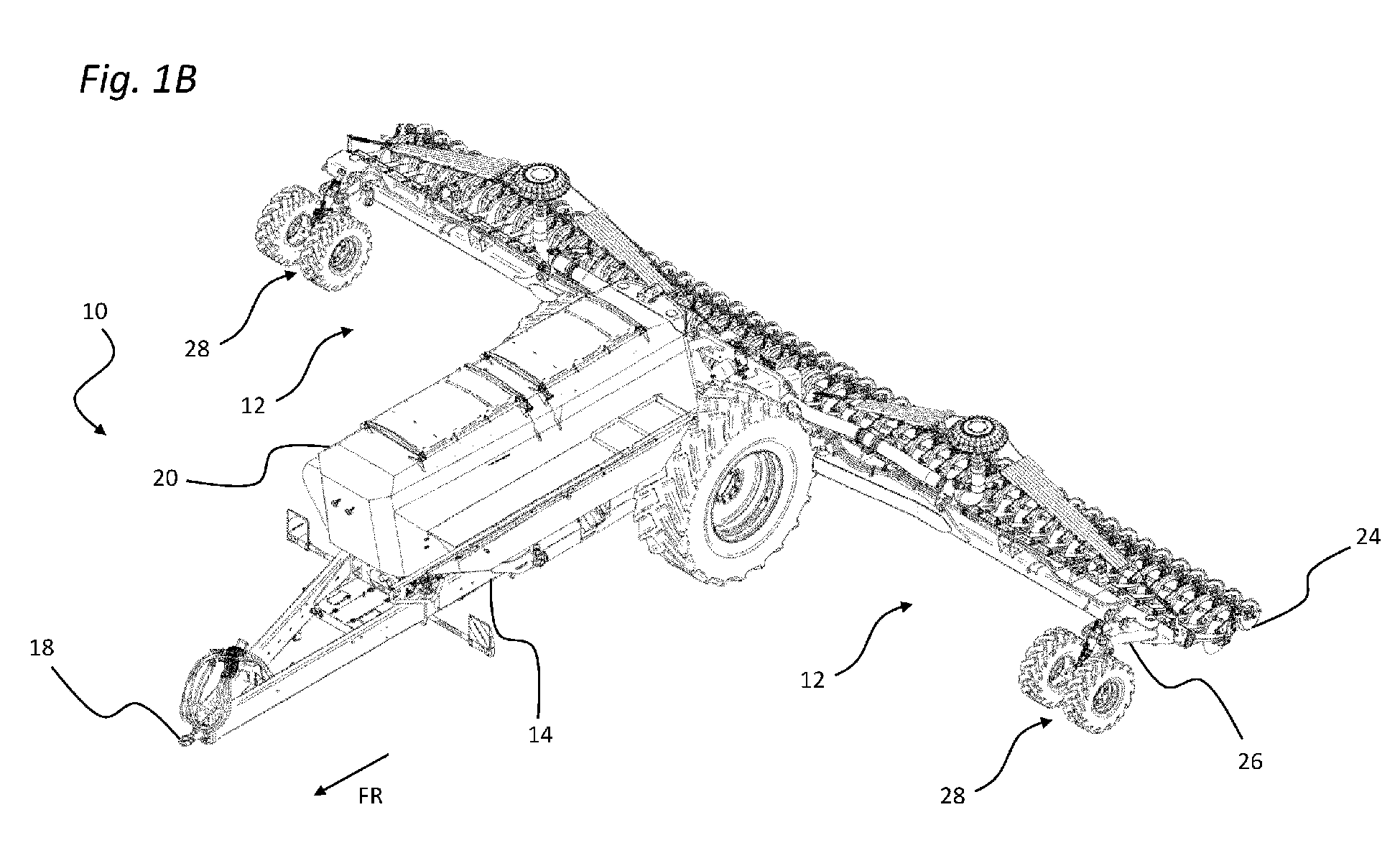 - the working width is defined by a longitudinal extension of the side parts 12 transverse to the direction of travel FR in the working position.