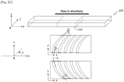 - the plurality of engraved structures may form a curved micropattern formed from a first point, which is the starting point, to a second point, which is the end point, and the tangent of the first point may have an angle of 45 to 135 degrees with respect to the main flow direction of the fluid, and the tangent of the second point may have an angle of 0 to 75 degrees or 105 to 180 degrees with respect to the main flow direction of the fluid.