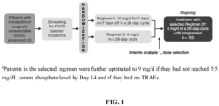 - the dose of erdafitinib is increased from 8 mg once daily to 9 mg once daily at 14 to 21 days after initiating treatment if: (a) the patient exhibits a serum phosphate (PO4) level that is less than about 5.5 mg/dL at 14-21 days after initiating treatment; and (b) administration of erdafitinib at 8 mg once daily resulted in no ocular disorder; or (c) administration of erdafitinib at 8 mg once daily resulted in no Grade 2 or greater adverse reaction.