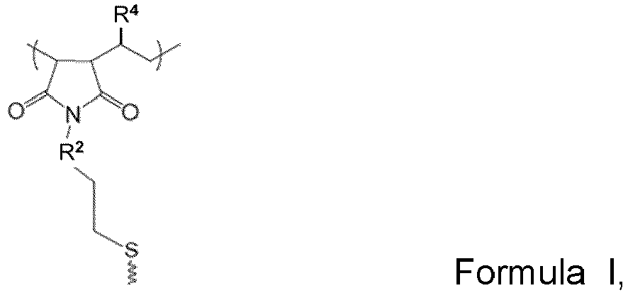 - the molar ratio of the first polymaleimide repeat units to the second polymaleimide repeat units is between 5 and 95, preferably between 10 and 70, more preferably between 20 and 50.
