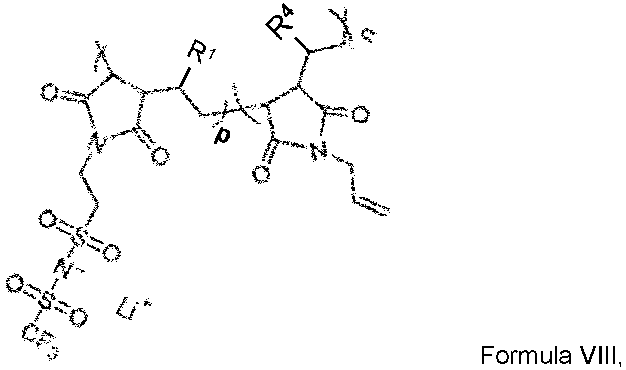 - the inventors have discovered that when the molar ratio of the first polymaleimide polymer to the second polymaleimide polymer is between 5 and 95, the polymer electrolyte has an excellent ionic conductivity in combination with optimal mechanical properties.