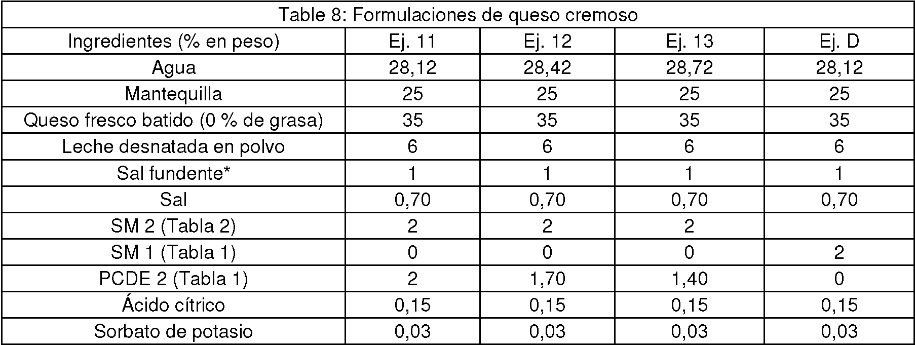 cremoso; composiciones de postres lácteos; y composiciones de emulsión de aceite en agua, tales como, p. ej., aderezos para untar y mayonesa de contenido reducido de grasa. En una realización, la composición alimenticia que contiene el agente texturizante descrito en la presente memoria se selecciona de una composición de yogur, una composición de queso, una composición de queso cremoso, una composición de postre lácteo y una composición de emulsión de aceite en agua.