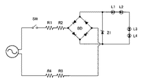 FIG. 5 shows an embodiment of a circuit for driving the LEDs L1 to L4. The voltage from the power supply is applied to a pair of terminals of the diode bridge circuit BD via the switch SW and the resistors R1, R2, R3, R4. The voltage rectified by the bridge circuit BD is taken out from another pair of terminals of the bridge BD, is made constant by the Zener diode Z1, and is applied to the LEDs L1 to L4. This electric circuit is housed in a partial space between the