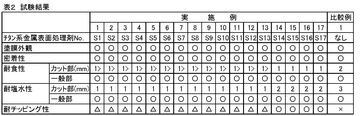 上記表面処理高張力鋼板の上に、上記表1に示す各チタン系金属表面処理剤を、後記表2に示す組み合わせにて、乾燥膜厚が0.3μmとなるようにバーコーターにて塗装し、最高素材到達温度100℃で3秒間かけて乾燥を行い処理膜を形成させた後、カチオン電着塗料エレクロンGT−10(関西ペイント(株)製、エポキシポリエステル系カチオン型電着塗料)を電着塗装し、170℃で30分間焼付けし、乾燥膜厚約20μmの電着塗装板を得た。この電着塗面に中塗り塗料(「TP65グレ−」、関西ペイント(株)製、有機溶剤系)を膜厚30μmになるようにスプレーにて塗装し、140℃で30分間焼付けた。その後、上塗り塗料ネオアミラック#6000ホワイト(関西ペイント(株)製、有機溶剤系)を、乾燥膜厚が約30μmとなるようにスプレーにて塗装し、140℃で20分間乾燥機にて焼付け、各試験塗板を得た。