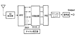 このように送信されたOFDM信号を処理する受信機の基本構成を図7に示して説明する。先ず、ガードインターバル除去器で受信信号のガードインターバル部分を取り除き、図6のFFT区間の信号を抽出する。その後、フーリエ変換器でFFT区間においてフーリエ変換を行ない、時間領域から周波数領域に受信信号を変換する。次に、送受信機間で既知な信号であるパイロット信号を用いて、伝搬路によって歪んだ振幅と位相成分をチャネル推定器で求め、それを用いて同期検波器で信号を復調し、デインターリーブ後に誤り訂正復号される。また、受信機の構成を簡単にするために、同期検波器の替わりに遅延検波器を用いる構成も考えられており、その場合にはチャネル推定器は不要になるが、同期検波方式に比べて伝送特性は劣化する。