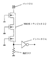 図3は一般的な従来の電圧検出回路を示す回路図である。テスト用動作モードに切り替えるために高電圧を印加するパッド31、n個のNMOSトランジスタ32、抵抗33、インバータ34から構成されている。パッド31とグランド電圧との間に直列にNMOSトランジスタ32と抵抗33が接続されており、抵抗33のハイ電圧側がインバータ34の入力となっている。この回路ではパッド31に直列接続されたn段分のNMOSトランジスタ32の閾値電圧の合計(n×Vth)よりも高い電圧が印加されるとインバータ34が反転し、出力はHレベルからLレベルに変化しテスト用動作モードに切り替わる。