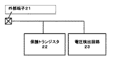 図2はテスト用動作モード検出機能を有した外部端子21、テスト用動作モード用電圧検出回路23、静電気的なノイズが印加した時にICを保護するための保護トランジスタ22を示したブロック図である。