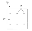 その後、図8(c)に示すように、上記層間絶縁膜112に対し、第2のフォトマスク26を用いて比較的高照度で露光を行う。第2のフォトマスク26は、図6に示すように、光を透過する透過部28が複数開口され、該透過部28以外の部分が遮光部27に形成されている。そして、透過部28は、上記層間絶縁膜112の露光時に、ドレイン配線113上の所定の位置に対応して配設される。