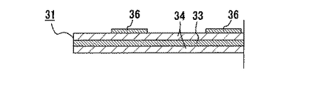 図1,図2,図3に示されるように、セラミック基材11の上面12(主面)には、長尺状のポリマ光導波路フィルム31が図示しない接着剤層を介して接合されている。より詳細には、フィルム31の左端は図1における左側のセラミック基材11に接合され、フィルム31の右端は図1における右側のセラミック基材11に接合されている。このフィルム31は、コア33及びそれを上下から取り囲むクラッド34を有している。実質的にコア33は光信号が伝搬する光路となる。本実施形態の場合、コア33及びクラッド34は、屈折率等の異なる透明なポリマ材料、具体的には屈折率等の異なるPMMA(ポリメチルメタクリレート)により形成されている。光路となるコア33は4つであって、それらは直線的にかつ平行に延びるように形成されている。コア33を形成する材料は、クラッド34を形成する材料よりも数%ほど屈折率が高くなるように設定される。コア33及びクラッド34の厚さは、それぞれ数十μm程度に設定されている。また本実施形態では、フィルム31のセラミック基材11に対する非接合面(即ち図1,図3等における上面)側には、パッド36が導電性材料を用いて形成されている。なお、かかるパッド36は位置合わせ基準部としての役割も有する。また、フィルム31のセラミック基材11に対する非接合面には、同じく導電性材料を用いて導体パターン38も形成されている(図2参照)。導体パターン38はパッド36に接続されている。