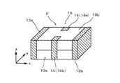 (5)次に、図2に示すように、セラミック焼結体Fの表面に、コイルパターン7、及びコンデンサ用ホットパターン2bと導通する外部電極(入出力端子)13a、13b、ならびにコンデンサ用グランドパターン2aと導通する外部電極(グランド端子)14(14a,14b)をそれぞれ形成し、図2に示すような積層セラミック電子部品(チップ型積層LCフィルタ)15を得る。