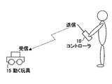図7は、従来の遠隔操作システムの一例の概略構成図を示す。同図中、コントローラ10は送信部を有し、操作者の操作により発生した操作信号を無線または赤外線で送信する。動く玩具15は受信部を有し、コントローラ10からの操作信号を受信し、この操作信号に応じて玩具内蔵のアクチュエータを作動させて動く玩具15を動作させる。