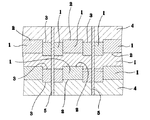 一方、上記小幅板31の裏面の上記表面の凹部33と対応する位置に、小幅板31の幅寸法の2倍の寸法からなる凸部32を形成し、その片側辺に上記傾斜部と同様の傾斜部36を形成し、反対側の角を削除した形状の傾斜部37を形成してある。そして、図中34と38が表面仕上げ用小幅板で、いずれも片側表面を平面としてある。そして、表面仕上げ用小幅板34の反対面に上記内部構造用小幅板31の表面の凹凸部と同様の凸部32と凹部33を形成してある。一方、表面仕上げ用小幅板38の反対面には、内部構造用小幅板31の裏面の凹凸部と同様の凸部32と凹部33を形成してある。