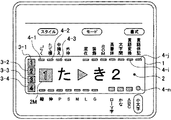 液晶ディスプレイ35の表示面は、例えば、図3に示すようになっている。液晶ディスプレイ35の表示面1は、文字表示領域2と、行番号インジケータ3−1〜3−4と、入力文字列に係る各種の属性等を表す属性インジケータ4−1〜4−nとを有する。属性インジケータ4−1〜4−nは、そのオン表示が、その属性インジケータ4−1、…、4−nに対応した表示面1の周囲に記載されている文字が表す属性が採用されていることを表すものである。属性インジケータ4−1、…、4−nが指示する属性としては、文字サイズについてのものや、かな入力やローマ字入力等の入力方式についてのものや、たて書や中揃え等の文字列のある程度のかたまりを単位としたものや、装飾文字や英書体等の文字単位のものや、基本的な書式の採用有無を表すものなどがある。