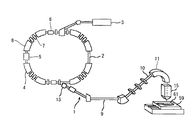 シンクロトロン4から出射されたイオンビームは、ビーム輸送系9を経て照射装置である照射野形成装置(放射線照射装置)15に達する。ビーム輸送系9の一部である逆U字部10及び照射野形成装置15は、回転可能なガントリー(図示せず)に設置される。逆U字部10は偏向電磁石11を有する。イオンビームは、照射野形成装置15から治療台(ベッド)59に乗っている患者61の患部62(例えば癌や腫瘍の発生部位。図2参照。)に照射される。