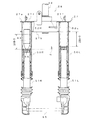 また、ボトムブリッジ27のステアリング軸26を中心とした対称な位置にはフォークパイプの支持筒軸50が下方から挿着されており、これら支持筒軸50はその上端を上板部27aの下面に当て付けて溶接(溶接部62a)されるとともに下板部1bに溶接(溶接部62b)されている。