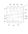 そこで、本願出願人は、工夫を重ねた結果、つなぎ材60で隣り合うガーター50の中央部分を連結して排水負担領域を2分割し、つなぎ材を境として両側に雨水が振り分けられるようにした。そして、図16のように、排水負担領域、すなわち、隣り合うガーター50、つなぎ材60、及びレール30によって囲まれる矩形の構面の対角線の交点に各々のドレーン90a乃至90hを位置させるようにした。このようにすると、局部的に水たまりができる等の排水不良が発生せず、各々のドレーン90a乃至90hから良好に排水されることを知った。