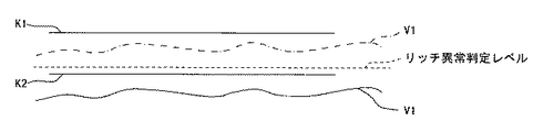 従って、図3に示すように、特性診断異常検出判定レベルK1は、予め設定したリッチ異常判定レベルよりも緩い値に設定されている。一方、特性診断異常検出判定レベルK2は、上述したシステム制御上のばらつきを考慮せず、基準電圧に、個体差によるばらつきを考慮した値を加算しただけであるため、リッチ異常判定レベルと同じか、やや厳しい値に設定されている。 Therefore, as shown in FIG. 3, the characteristic diagnosis abnormality detection determination level K1 is set to a value that is looser than a preset rich abnormality determination level. On the other hand, the characteristic diagnosis abnormality detection determination level K2 is the same as the rich abnormality determination level because the above-described variation in system control is not considered and only a value considering variation due to individual differences is added to the reference voltage. It is set to a somewhat severe value.