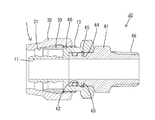 次に、本発明を具体化した実施形態4を図9を参照して説明する。本実施形態4の管継手Jdは、継手本体60の後端部に、プラグ61を、前後方向の軸線を中心として自在に回転し得るように設けたものである。継手本体60の後端部には、プラグ61を収容する円形の取付孔62が形成され、取付孔62の内周には、周方向に係止溝63が形成されている。プラグ61は、その前端部を取付孔62内に径方向のガタ付きなく且つ取付孔62の内周に摺接しつつ継手本体60に対して周方向に相対回転し得るように嵌合されている。プラグ61の外周には、取付孔62の係止溝63と対応する係止溝64が形成され、双方の係止溝63,64には略C字形の抜止リング65が係止されている。この抜止リング65の係止作用により、プラグ61は、周方向の回転は許容されるが、軸方向の変位を規制された状態で継手本体60に取り付けられている。尚、継手本体60の前端部には、実施形態と同じ構成のロック機構Lが設けられている。また、プラグ61の後端部には、ホースや樹脂チューブ(図示せず)などを接続するためのネジ部66が形成されている。